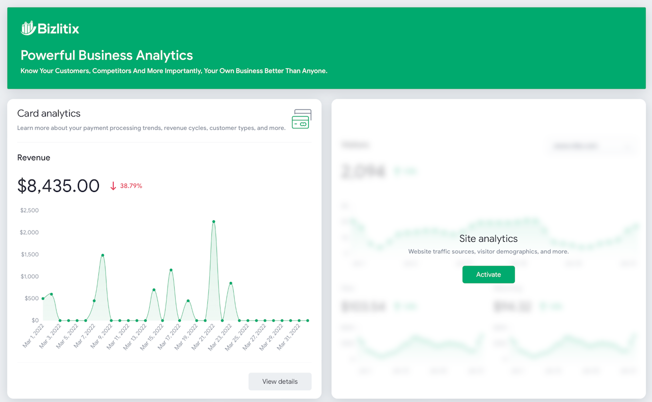 Bizlitix (business analytics) is a powerful data management and analytics tool integrated into the Dashboard.